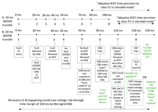 Figure 7 shows the flowchart for the clearance of fault F2 in both grid-connected and islanded modes by adaptive IED6 by tripping CB6 and sending trip signal XCBR “open” to IED7 for tripping CB7. With CB6 and CB7 open, two separate islands were created within the islanded AC microgrid, one supplied by only PV (LV microgrid) and other supplied by only WTG (MV microgrid). If fault F2 occurs in the grid-connected mode, then only the LV microgrid will be isolated, and the MV microgrid will operate in the grid-connected mode. IED7 will also need the current flow direction in the case of fault F2, since this fault will be energized by both PV and WTG in islanded mode, which will avoid nuisance tripping by IED6 in the case of bus-3 fault or fault F3 at the LV load. IED7 can easily know if the fault is upstream or downstream of its location after receiving “YES fault GOOSE” from IED6 by simply calculating the RMS magnitude of the current at its location. If the magnitude of current at IED7 is ≤1.2 p.u. of the normal set current, the fault is considered to be upstream of IED7, since the fault contribution at IED7 will come from downstream PV only. In this case, IED7 will send “NO fault GOOSE” to IED6. If the magnitude of the current at IED7 is >1.2 p.u. of the normal set current, the fault is considered to be downstream of IED7. In this case, IED7 will send “YES fault GOOSE” to IED6, and IED6 will wait until the next GOOSE from IED7. The red and green colors in Figure 7 differentiate between the grid-connected and islanded mode features. On the failure of CB6, IED6 will trip CB2, CB3 and CB7 to clear F2 in the grid connected mode, whereas CB7 and CB3 will be tripped in the islanded mode to clear fault F2 completely. Hence, CB6 failure during fault F2 in both grid-connected and islanded modes will cause complete power interruptions to MV microgrid loads. Figure 8 shows the steps for the clearance of fault F2 using GOOSE messages with different transmission delays. It should be noted that, in steps 5 and 6 and 7 and 8 of Figure 6 and Figure 8, the time delay for circuit breaker operation is considered 20 ms, which is one cycle of 50-Hz supply. This means high-speed AC circuit breakers operating in one cycle [43] will be required for the implementation of the proposed adaptive OC protection scheme.