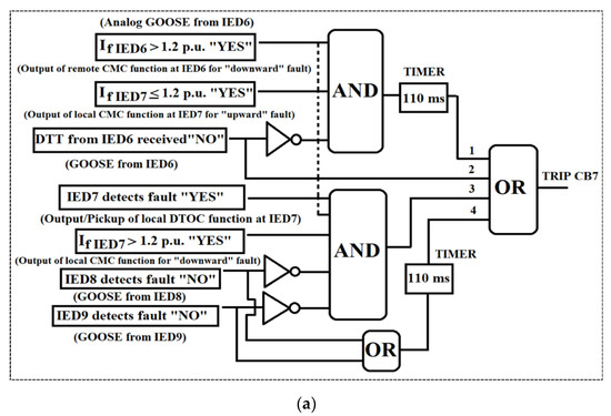 Table 2 shows the normal flow of currents measured at the IED1, IED2, IED6 and IED7 locations during four different DG scenarios in the grid-connected mode. The maximum currents used for the adaptive DTOC settings are also indicated in Table 2. The fault current magnitudes at the concerned IEDs during the short-circuit fault F1 in the grid-connected mode and the short-circuit fault F2 in the islanded mode are shown in Table 3. Table 4 shows the DTOC settings and time grading of the IEDs 1, 2, 6 and 7 in the grid-connected and islanded modes. In this study, only the high-stage setting group (I>>) of Table 4 was used for the detection of the three-phase short circuit faults, and the isolation of the fault (tripping) is totally dependent on the GOOSE message transfer, according to Figure 6 and Figure 8. However, in the case of complete communication failure, the time grading of Table 4 ensures selective operation. Table 5 explains the adaptivity and current magnitude comparison (CMC) requirements at IEDs of Figure 2 for three-phase faults (F1–F9) at different locations in different modes of operation. In the grid-connected mode, the higher setting group like that given in column two of Table 4 will be applied for all IEDs irrespective of the connection and disconnection status of DGs. This higher setting group is denoted by SG GM in Table 5 to represent the active settings in the grid-connected mode. For all IEDs except IED1, IED5 and IED8, a separate local current magnitude comparison function/logic is proposed for the operation in both the grid-connected and islanded modes when DGs are actively participating in load sharing with the connection status “YES”. The CMC function in the IEDs will logically work in parallel with the communication-based DTOC protection and would act quickly with the “transfer trip communication failure” signal to trip the local downstream IED during the upstream fault if it does not receive the transfer trip signal (CB status “OPEN”) from the upstream IED after a predefined time period (time period between step 6 and 7 in Figure 6). The CMC function will continuously receive the analog value of the current from the local MU and compare it with the current threshold of 1.2 p.u. of the max current; if the current is less than the threshold and the upstream IED also sends a fault detection GOOSE “YES”, the fault is assumed to be the upstream fault. Then, if no transfer trip GOOSE is received from the upstream IED within 110 ms of the fault (event 7 in Figure 6), the IED will trip the local circuit breaker to clear the fault completely. In this way, the CMC function implemented in the communication-based adaptive protection (Figure 7) could not only detect the direction of the fault, but it could also act as a backup for direct transfer trip (DTT) communication failure. The proposed CMC function can only work for the feeder with a strong DG source on one side and a comparatively weaker DG source with a predefined fault current contribution on the other side. For example, during the fault F1 in the grid-connected mode when the connection status of both the WTG and PV is “YES”, the IED2-IED4, IED6-IED7 and IED9 all will need the CMC function to determine if the fault is at the downstream or the upstream location. However, only IED2 will activate the CMC trip function after the transfer trip GOOSE message from IED1 is found undetected (not received). In the same way, during the fault F2 in the islanded mode of operation when the connection status of both the WTG and PV is “YES”, the IED6-IED7 and IED9 need the CMC function to know if the fault is upstream or downstream of these relays. IED6 using the CMC function will detect the fault F2 to be downstream, while IED7 and IED9 will detect the fault to be upstream of their locations. Then, when the transfer trip GOOSE from IED6 is not received by the IED7, it will initiate the backup using CMC logic to trip CB7 in order to clear the fault F2 completely, while IED9 will continue following the LVRT curve. The topmost AND logic in Figure 9a,b presents the backup for DTT failure from IED6 during the fault F2 using the CMC function/logic. It should be noted that, in the islanded mode, when the connection status of both the WTG and PV is “YES”(the scenario of Table 5, column 3), then the WTG of 2 MW acts as a comparatively stronger source than the PV of 0.4 MW. Therefore, the grid-connected mode settings “SG GM” for IED6-IED9 will remain effective and unchanged in this islanded mode scenario, and only IED3-IED5 need to change to the islanded mode settings (SG IM). This way, the minimum number of IEDs will need to adapt to the islanded mode settings, and simple logics for the primary and backup protections, for example, at IED7 (Figure 9a), could be used. This will also prevent the OC function of IED7 and IED9 to start pickup for the “out of zone” fault F2 in the islanded mode scenario of Table 5, column 3.
