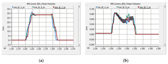 RMS magnitude of the current before, during and after fault F1 at: (a) IED1 and (b) IED2 (CB2 transfer trip).