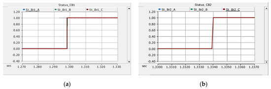 Operating time and status of breakers before, during and after the clearance of fault F1: (a) CB1 (main protection trip) and (b) CB2 (direct transfer trip). CB Status: 0 = False (NO trip/Close) and 1 = True (YES trip/Open).