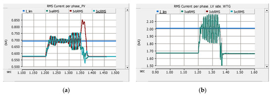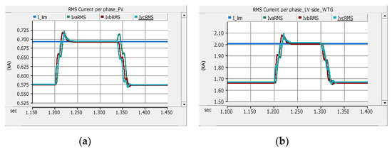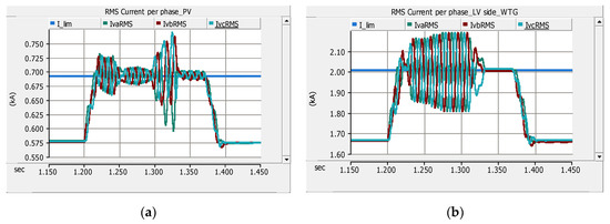 RMS magnitude of current per phase of DGs before, during and after fault F1 (CB2 transfer trip): (a) LV side of the PV system and (b) LV side of WTG. Note: I_lim is the preset limit of the fault current contribution of DGs.