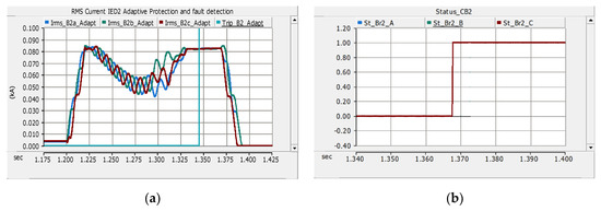 Adaptive IED2 trip after the unsuccessful direct transfer trip from IED1: (a) RMS magnitude of the current at adaptive IED2 and relay operating time and (b) CB2 status and operating time during an IED2 adaptive trip.