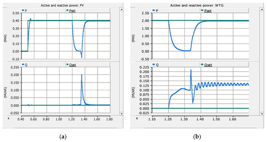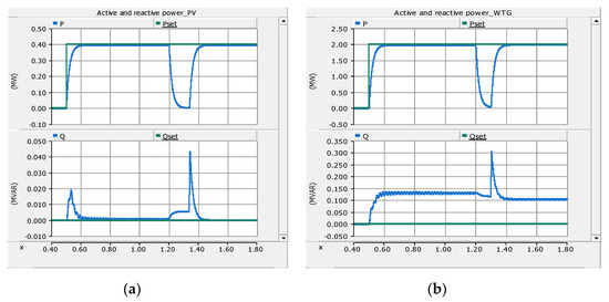 T Active power (P) and reactive power (Q) supply from DGs before, during and after fault F1: (a) P and Q from the PV system and (b) P and Q from the WTG. Note: WTG supplies the entire Q demand in islanded mode.