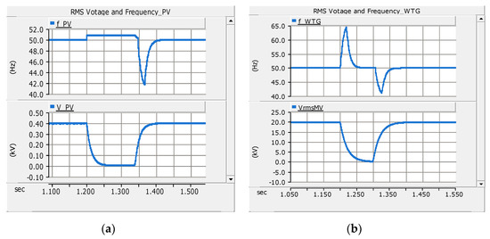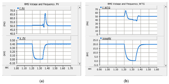 Three-phase RMS voltage and frequency of DGs before, during and after fault F1 (a) low-voltage (LV) side of the PV system and (b) medium voltage (MV) side of the WTG.