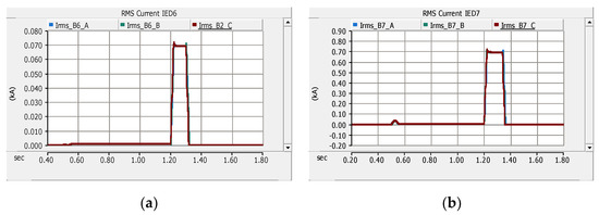 RMS current magnitude before, during and after fault F2 in the islanded mode at: (a) IED6 and (b) IED7 (IED7 direct transfer trip).