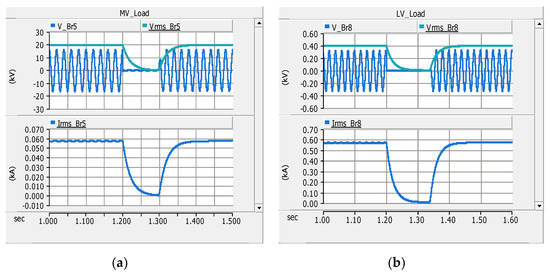 Three-phase RMS voltage and current and single-phase instantaneous voltage at loads before, during and after fault F1: (a) MV load and (b) LV load.