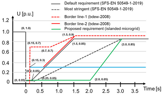 The low-voltage ride through (LVRT) capability of the nonsynchronous generators, including the converter-based generators: The red and blue voltage-time curves according to [32] and the black voltage-time curves according to [47]; the green voltage-time curve is the new proposed LVRT curve for the islanded mode of operation.
