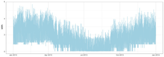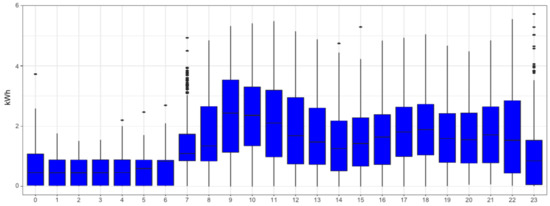We can analyze the daily seasonality of the different smart meters. For instance, Figure 4 and Figure 5 reveal households that decrease consumption during night hours. A similar analysis on weekly seasonality shows that it may also play a relevant role in the time series. Hence, we will consider both the daily and weekly patterns in our methodology. Moreover, from previous figures we can also observe the asymmetric distribution of electricity consumption. This motivates our choice to apply a logarithm transformation to make it more symmetric.