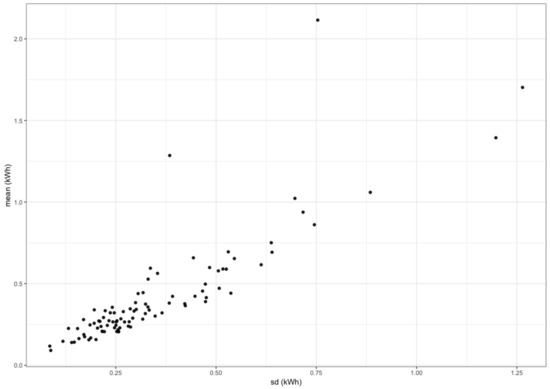 In Figure 3, we can see a scatter plot containing the average consumption in 2013 for each smart meter in ACORN-A versus the corresponding standard deviation. Note the clear linear relationship between consumption and variability, indicating the necessity to normalize the 93 consumptions to make the group more homogeneous.
