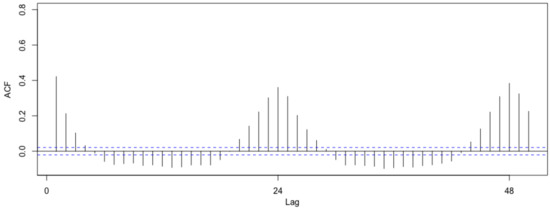 If we analyze the autocorrelations of household consumptions, useful and different patterns appear. From Figure 6 and Figure 7 we can observe different patterns of consumption for 18th and 92nd households, respectively. In particular, household 18th presents a high consumption dependency respect to the previous period that decays slowly (long memory). On the other hand, 92nd household presents a small dependency with a higher rate of decay (short memory). In both cases we can observe the dependency respect to previous 24 h which is an indicator of the daily seasonality previously mentioned.