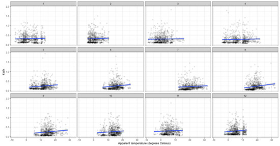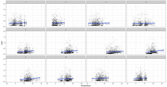 Next, we analyze the relations between the consumption and meteorological variables. For instance, Figure 8 and Figure 9 show the relation between consumption and temperature for the 18th and 92nd households. We can observe that this relation changes throughout the year as expected, so that it should be considered in the forecasting model. We have also repeated this analysis to other smart meters selected by chance from the other 18 groups obtaining similar insights.