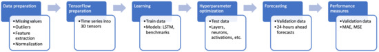 In this Section, we will explain in detail the proposed methodology, which is illustrated in Figure 10. As mentioned before, our methodology will be based on ANN and DL because they are flexible and powerful in general, an in particular they can deal with multidimensional time series with complex interactions in a natural way. Specifically, we will use RNN for sequential data (time series) which has been proven to work successfully in natural language processing and speech recognition. Recurrent neural networks are a type of neural network where outputs from previous time steps are taken as inputs for the current time step. This creates a network graph or circuit diagram with cycles, which can be unfolded over the input sequence to make predictions over many time steps.
