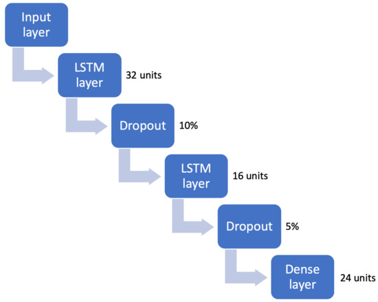 The LSTM model in Keras is defined as a sequence of layers. In our experiments, all the LSTM models are trained with the same network topology as follows (Figure 11). The first layer in the network defines the 3-dimensional units of the tensors as explained before. This layer is a LSTM one containing 32 units or number of neurons. Then we need to define the activation function to transform the output from each unit as the input for the next layer. The choice of this activation function is important and will affect the forecasting performance. We have used the hyperbolic tangent as the activation function, but others can be used as the sigmoid or softmax ones. Then, multiple layers can be stacked by adding them to the sequential process. In our case, we have added another LSTM layer with 16 units, and finally a dense layer (or fully connected one) with 24 units that will provide the corresponding 24-h ahead forecast.