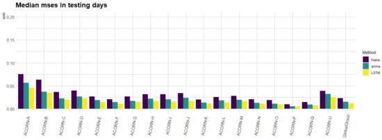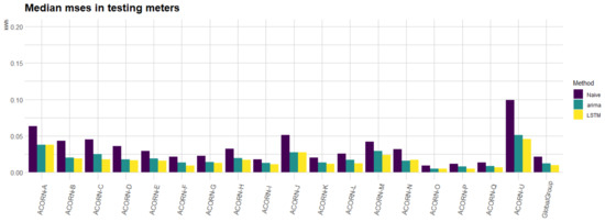 In this section, we summarize the main numerical results obtained when applying the three approaches (naive, auto.arima, and the proposed LSTM model) for each of the 19 groups considered. In Figure 13, we can observe the median MSEs for the three implemented approaches along the testing meters. In particular, for each of the smart meters in the testing set for each group, we have computed the median error for all the MSEs obtained in the out-of-sample days in the back-testing. It can be noted how the auto.arima approach is on average a 5% better than the naive approach but sometimes is a bit worse. On the other hand, the LSTM approach attains the best performance. In particular, the performance of the LSTM approach is around 19% better than that of the auto.arima and around 24% better than that of the naive approach. That implies a good performance of the proposed methodology even for new customers in the database.