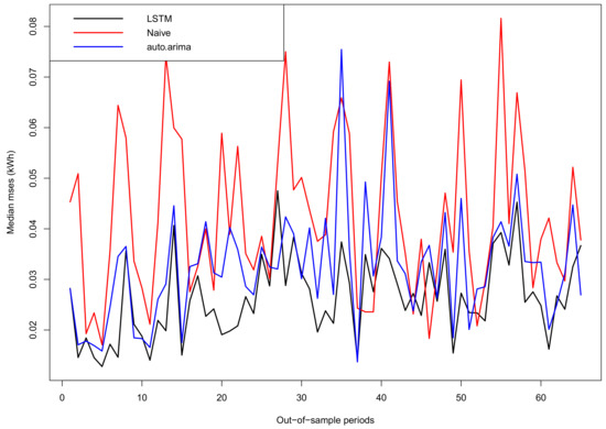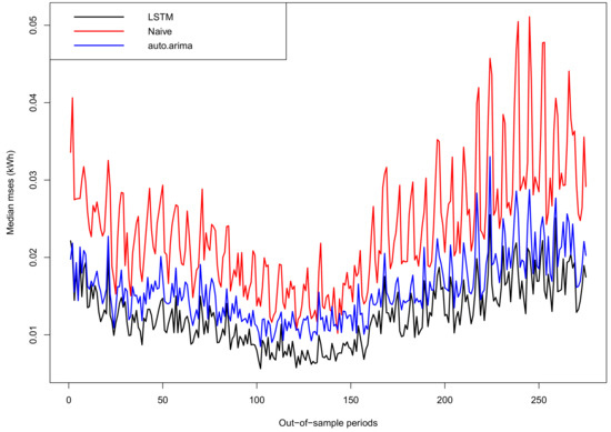 On the other hand, Figure 14 shows the median MSEs for all smart meters along the out-of-sample days. Note the errors of auto.arima and naive approaches behave similarly along time (auto.arima performs around 3% than the naive), while the proposed LSTM outperforms the naive approach by 24% on average and the auto.arima one by 21% on average over all the out-of-sample periods.