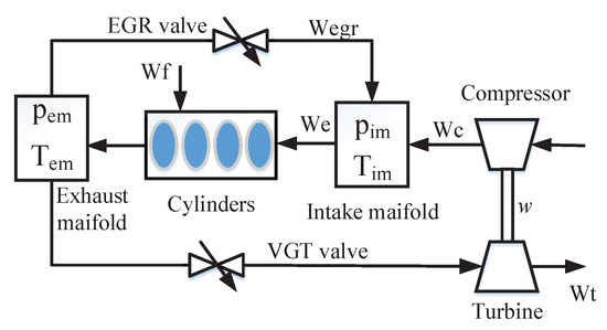 As one of the main power sources of trucks and ships, diesel engines have the characteristics of strong power performance, good fuel economy and long service life. However, the increasing number of diesel engines makes energy shortage more serious. In addition, the exhaust emissions of diesel engines are mainly nitrogen oxide (NOx) and particulate matter (PM), which are one of the main causes of haze formation. With the increasingly stringent emission regulations and the continuous improvement of power and economy requirements, variable geometry turbine (VGT) and exhaust gas recirculation (EGR) technology has become widely used in diesel engines. Part of the exhaust gas generated in the cylinder is delivered to the intake manifold through the EGR valve to reduce NOx emissions. However, excessive exhaust gas entering the intake manifold can cause insufficient fuel combustion. The other part of the exhaust gas through the VGT valve drives the turbine, which drives the compressor to absorb more fresh air and improve the combustion efficiency. However, excessive exhaust gas emissions will reduce the exhaust gas back to the intake manifold, thus increasing NOx emissions. In addition, complex system dynamics phenomena such as sign inversion, nonminimum phase and overshoot also exist in VGT-EGR system [1,2,3]. Therefore, the precise control of VGT-EGR system in diesel engines is very important to reduce emissions. At the same time, cross coupling and complex system dynamics make it difficult to control VGT-EGR system accurately.