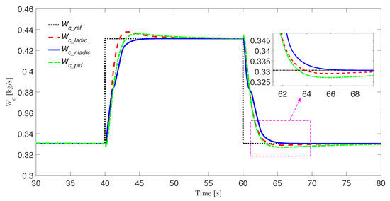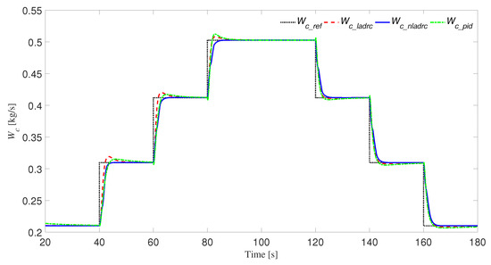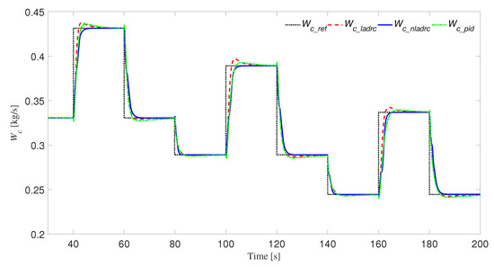 Because the diesel engine needs to change the working condition frequently, the controller designed must be able to have strong robust performance to the changing working condition. In this part, we mainly verify whether the NLADRC controller has strong robust performance to the change of working conditions from the two aspects of speed and fuel injection . First, we verify that the controller is robust to changes in speed. Before 80 s, the speed of diesel engines is 1900 r/min. The engine speed is reduced to 1700 r/min and 1500 r/min at the time of 80 s and 140 s, respectively. Figure 11 and Figure 12 respectively show the response curves of intake manifold pressure and mass air flow before and after changing the speed. In addition, the fuel injection of the engine is increased from 50 mg/cycle to 200 mg/cycle with steps of 50 mg/cycle, and the simulation images are obtained without adjusting the control parameters, as shown in Figure 13 and Figure 14. In the p loop and the W loop, the NLADRC controller can track the given signal faster and better without recalibrating parameters after changing the engine speed and fuel injection. Therefore, the NLADRC controller has strong robustness to the change of diesel engine operating conditions.