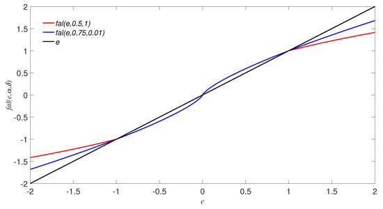 Compare the tracking effect of intake manifold pressure in Figure 4, or the tracking effect of mass air flow in Figure 5. Obviously, system with NLADRC controller tracks square wave signals better. In the figure, the NLADRC controller tracks the desired intake manifold pressure or mass air flow without overshoot, while the LADRC controller and PID controller have relatively large overshoot. The intake manifold pressure and mass air flow of diesel engines are the outputs of dynamic system, which have certain inertia and cannot change suddenly. However, the set values and are given outside the system and can be changed instantaneously. If we use their deviation to produce control effect directly, it will lead to the initial error is too large, and the controller will have a great control effect, which will have a great impact on the system and easy to produce overshoot. TD was mentioned earlier when we introduced the structure of the NLADRC controller designed for the loop. In the loop, TD converts transient intake manifold pressure into a slow-varying transition process signal . In this way, the slowly changing transition process signal minus the output signal of diesel engines will not produce excessive deviation, and NLADRC controller will not produce excessive control effect, so that the intake manifold pressure of the diesel engine does not generate overshoot. In the previous NLESO design, we introduced the nonlinear function , whose image is shown in Figure 6. When the parameter of the nonlinear function is equal to 1, it becomes a linear form of the error. As can be seen from the figure, the linear form and the nonlinear form intersect at . When the error is greater than 1, the value of the nonlinear function is less than that of the linear form, so the control effect generated by the NLADRC controller is less than that of the linear form, so the system response with the NLADRC controller will not produce overshot.