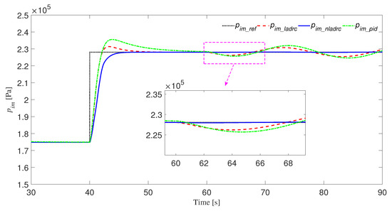 In this part, we will design the discrete NLADRC controller for VGT-EGR system and give the simulation results. Due to the discrete controller adopted in the subsequent simulation, we discretize (16), and then discrete NLESO for the intake manifold pressure p is expressed as
