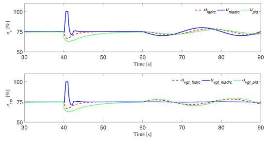 In the previous section, we compared the effect of three controllers on tracking square wave signals. In this part, we will verify the resistance of the three controllers to control disturbances. The control disturbance is d in the NLADRC controller structure described in Section 3. In this part, we take the loop as an example to compare the resistance of the three controllers to external control disturbances. At 40 s, we set the desired intake manifold pressure, and over time the diesel engine’s intake manifold pressure reaches the desired value. In addition, then at 60 s, we add a square wave control interference with an amplitude of 10 and a width of 10 s. Figure 7 shows the resistance of the three controllers to square wave disturbances. It is obvious that the response curve of the NLADRC controller has a slight amplitude change after adding the disturbance, and quickly returns to the expected value after 2 s. However, the amplitude variation of the LADRC controller and PID controller is much larger than that of the NLADRC controller, and the recovery time is relatively long. Next, we analyze why NLADRC controller is better than LADRC controller and PID controller in resisting square wave disturbance. First, let us look at the first figure in Figure 8, which shows the output signals of the three controllers. The NLESO in NLADRC controller accurately estimates the amplitude and period of the square wave form disturbance and compensates to the control effect . We can also see from the image of that at 60 s the compensated disturbance in the NLADRC controller is closer to the added control disturbance. The output signal of the controller plus the external control disturbance d is the input signal of the diesel engine, which is shown in the second figure of Figure 8. As can be seen from the figure, the is basically unchanged after disturbance is added. This is because the compensated disturbance in and the external disturbance d cancel each other. Therefore, compared with LADRC controller and PID controller, NLADRC controller can resist external interference better.