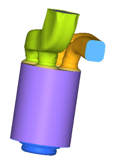 Before CFD analysis of the diesel engine, a grid model was built. The three-dimensional mesh model of combustion chamber including intake and exhaust ports, cylinder liners and piston upper surfaces was defined. According to the solution requirements of the Converge software, the maximum size of the surface grid was 3 mm, and the minimum size was 1 mm to simulate the complete working cycle of the diesel engine. Because of the small volume of the injector and the complexity of meshing, the parameters of the injector were set by the injection model in Converge. The model is shown in Figure 1.