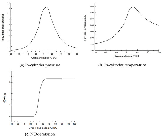 As shown in Figure 2a, when entering the fast combustion period, the pressure in the cylinder increases rapidly and reaches the peak value. From the end of the fast burning period to the end of combustion, the pressure decreases gradually. The highest value of cylinder pressure is about 6 crank angle (CA) after top dead center (ATDC), which is 16.7 MPa.