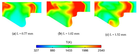 The different nozzle extension heights lead to the different positions of fuel spray and wall impact, the different degree of fuel-air mixing, and the different combustion efficiency. With the combustion model, at 30 CA ATDC, the temperature field distribution of different nozzle extending height is shown in the Figure 5. When the nozzle extends 0.77 mm, 1.02 mm, 1.52 mm respectively, the maximum average in-cylinder temperature is 1560 k, 1586 k, 1625 k accordingly. According to the reaction mechanism of NOx [15], higher temperature promotes the formation of NOx. Figure 6 is the curve of accumulated NOx production in the cylinder caused by the variation of nozzle extension height. With different nozzle extension heights, the cumulative NOx production in the cylinder changes significantly. When the height is 0.77, 1.02 and 1.52 mm, respectively, the NOx production is 2.942, 3.331 and 3.804 mg, accordingly. The results indicate that the change trend of NOx emission is consistent with the regression Equation (9) shown.