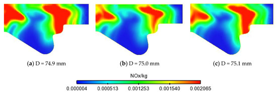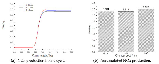 The variations of throat diameter and shrinkage diameter have an impact on the fuel-air mixture distribution, and then affect the combustion temperature and NOx emission as mentioned in Section 3.3. According to the simulation results as shown in Figure 7 and Figure 8, when the throat diameter is 74.9, 75.0 or 75.1 mm, respectively, the maximum average in-cylinder temperature is 1585, 1586 and 1560 K, accordingly. When the shrinkage diameter is 61.36, 61.46 or 61.56 mm respectively, the maximum average in-cylinder temperature is 1590, 1586 and 1594 K accordingly. This indicates that with the variation of chamber diameter, the accumulated amount of NOx in the cylinder also changes in Figure 9. When the throat diameter is 74.9, 75.0 or 75.1 mm, respectively, the NOx production is 3.334, 3.331 or 2.944 mg, accordingly; when the shrinkage diameter is 61.36, 61.46 or 61.56 mm, respectively, the NOx production is 3.321, 3.331 or 3.346 mg, accordingly. According to the regression Equation (9), NOx production decreases with the increase of throat diameter and increases with the increase of shrinkage diameter, which is consistent with the simulation results.