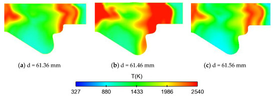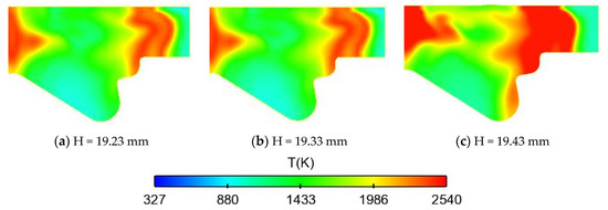The ignition position is at the edge of the fuel-air mixing position. As shown in Figure 3e,h, the flame diffusion direction is the same as that in the spray direction, and the fuel near the wall begins to burn. Then the flame further diffuses to the clearance and the bottom of chamber. It can be seen from the Figure 3i that the temperature distribution in the combustion chamber is relatively uniform, and the fuel is almost completely burned at this time.