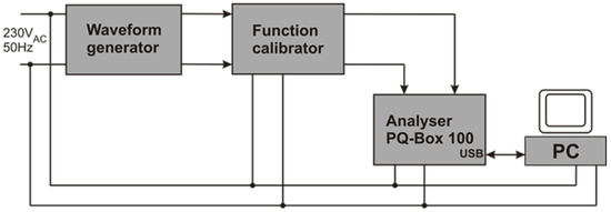 In the measuring system presented in Figure 1, a waveform generator allows us to set a certain shape of waveform and control the operation of function calibrator. The calibrator generates a signal with a shape set from the generator, and with certain root mean square (RMS) values of voltage. The waveform generator used in measurements was calibrated in the Main Office of Measures, where its accuracy was verified.