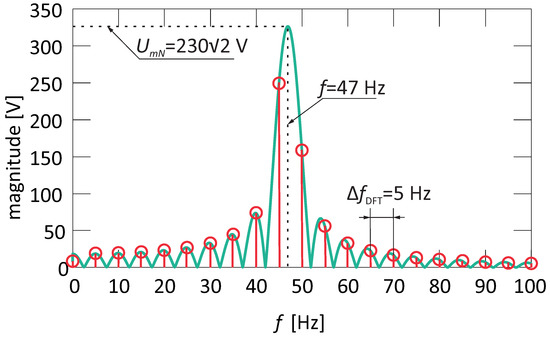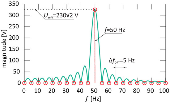 The transform of the product of two functions in the domain of time is a convolution of those functions in the domain of frequency. The effect of such operation is that side lobes occur in the considered signal. When the duration of measuring window is not a total multiple of the period of the primary signal considered, as a result of the occurrence of the side lobes of the considered signal, the spectral lines will be extended. This effect is named spectrum leakage phenomenon. In order to illustrate the spectrum leakage phenomenon, we are going to consider a sinusoidal signal. The result of discrete Fourier transformation can be identified with the sampling of continuous convolution of the considered signal spectrum and the measuring window. The sinusoidal signal spectrum with a frequency of is composed of two spectral lines in values . The convolution spectra of sinusoidal and rectangular signals with duration equal to the total multiple of the period of considered signal are presented in Figure 2. In such a case, a non-zero sample of the convolution spectrum for a frequency is equal to the fundamental frequency of the signal. The remaining samples will be taken in the zeros of the sinc(t) function. When the window is not an total multiple of the examined signal period, the spectrum convolution samples will be taken in different values of the sinc(t) function, which is presented in Figure 3. In the situation shown in Figure 3, the phenomenon defined as spectrum leakage occurs; its consequence is a strong disturbance at the window edge, and in practice the spectrum leakage causes changes in values and displacements of higher harmonics. Moreover, spectral lines, being subharmonics and interharmonics, can appear.