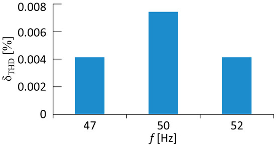 During the experiments, higher harmonics of voltage were measured, including the spectrum leakage in the range of acceptable power frequency changes. A three-phase class A analyser PQ-Box 100 was subjected to research in a designed and constructed measuring system presented in Figure 1. Higher harmonics were measured for triangle testing signal described with Equation (1). The research was carried out for the following frequency values of the considered signal: (47 and 52)—extreme acceptable frequency voltage values in a power grid per annum—and (49.9 and 50.1)—extreme values of voltage frequency deviation in practice, presented in Figure 5.