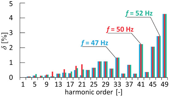 Error value distributions of particular odd harmonics for different frequency values, where blue bars are the results for voltage with a fundamental frequency of 47; red bars are the results for a voltage with a fundamental frequency of 50; green bars are the results for a voltage with a fundamental frequency of 52.