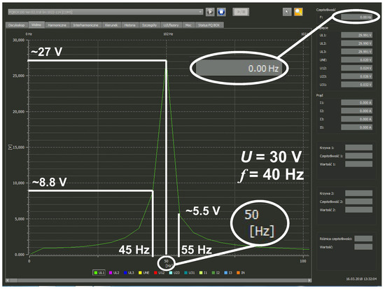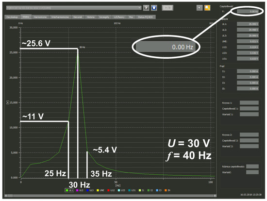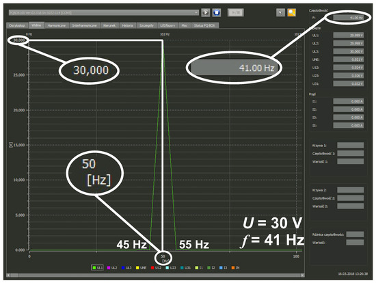 When the above mentioned threshold value 41 or 70 is exceeded, the analyser does not detect the frequency of the considered signal, and the effect of spectrum leakage is visible in the spectrum observed online. A few such cases occurred randomly as a result of research repeated many times. The highest spectral line occurred at the frequency of f = 50 for signal frequency equal to 40 or 71, at the frequency of f = 30 for signal frequency equal to 40, or at the frequency of f = 85 for signal frequency equal to 71. It must be pointed out, however, that, in real power grids, substantial deviations from the nominal frequency value do not occur. Figure 9 and Figure 10 present examples of two cases of such measurements.