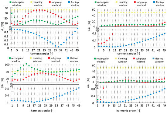 Therefore, the solutions proposed by the authors are compared with the subgroup method. The methods were compared using a simulation software developed in the Matlab environment. Figure 11 presents the simulation results depicting the value of error in the function of odd harmonics, for the considered values of frequency f. Because of significant differences in the values of error for particular windows, the vertical axis was divided, as if “dissected” in the diagrams, for better visualisation of the differences.