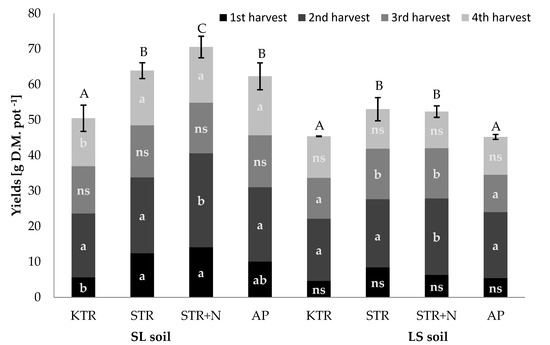Yields (D.M.—Dry Matter) of grass (sum of four harvests) on the two types of soil: silty loam (SL) and loamy sand (LS). Values followed by the same letters (a–b: for every harvest: 1st–4th, and A–C for sum of four harvests—separately for soils: SL and LS) are not statistically different (p < 0.05); ns: not significant. The standard deviation within each treatment (n = 3) is indicated by the line extending from the column.