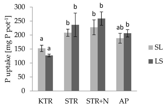 In both soils (SL and LS), P uptake by grass fertilised with STR and STR + N was significantly (p < 0.05) higher than in the KTR treatment (on average for STR and STR + N by approx. 43% in SL soil and 95% in LS soil) (Figure 3). In comparison to the KTR treatment (126.9 mg P pot−1), AP fertilisation significantly increased P uptake only in the LS soil (206.3 mg P pot−1). Irrespective of the type of soil (SL and LS), P uptake by the grass was similar in treatments fertilised with struvite (STR and STR + N) and AP. Our results support earlier findings that show that P uptake by maize was similar in the first and second year on struvite and triple superphosphate treatments in near-neutral pH soil [26]. Antonini et al. [33] showed that P uptake by ryegrass was similar or even higher from struvite than from artificial fertiliser. Bonvin et al. [24] showed that P uptake from struvite and water-soluble fertiliser (KH2PO4) by ryegrass cultivated on acid soil (pH 5.4) was similar. Johnston and Richards [40] found no differences in P uptake from struvite and monocalcium phosphate fertiliser by ryegrass cultivated on soils with a near-neutral soil pH. Everaert et al. [30] obtained a higher phosphorus uptake by plants from ammonium phosphate than from struvite. In our study, in the second year of the experiments, plants treated with struvite took up N and P more effectively than the ammonium phosphate-treated plants.