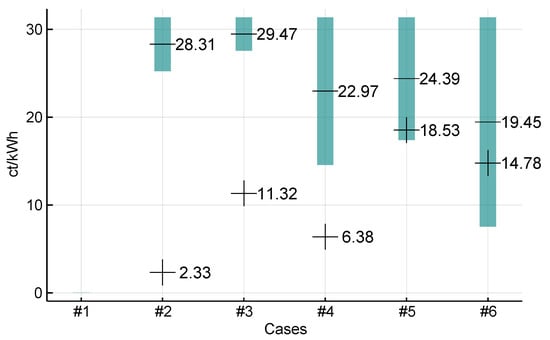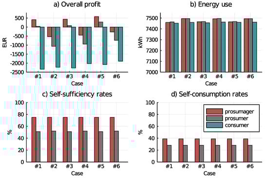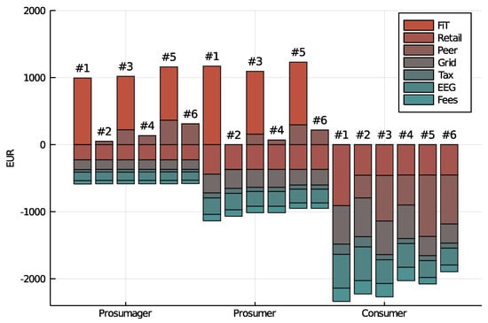 Table 5 illustrates the common columns of the case matrices (row 1 differs by whether a FiT is implemented or not). All energy flows that are not related to the pm are included here; see Figure 2. This is why they are constant over all cases—which only alters P2P tariffs. Columns 1–2 present the name and value of the costs introduced in Section 3; the columns to the right present the multipliers that the price component is multiplied with when a certain flow (column header) occurs. For example, the flow (from the PV system to the grid) adds 9.87 ct/kWh × 1 = 9.87 ct/kWh profit in the FiT case (row 1) and 9.87 ct/kWh × 0 = 0 ct/kWh in the case without FiT (row 2) to the objective function. Costs to be paid have negative multipliers (red) and profits have positive multipliers (green). Via matrix multiplication all tariffs are assigned to model flows appropriately. For all flows within a single building, no costs are induced, which is why most factors are zero.