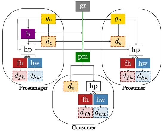 In this study, we consider a network of three user types, see Figure 2. The underlying home energy management systems are based on the study of Langer and Volling (2020) [30]. We model identical representative residential buildings with modulating air-sourced heat pumps (), as well as thermal storage systems for floor heating () and hot water (). The floor heating temperature and the hot water volume must be maintained within a certain comfort range. We consider two kinds of thermal energy buffers: the built-in thermal mass of the floor heating system and a domestic hot water tank. The details of the technical configuration can be found in Appendix A.