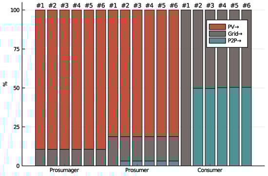Buildings of producers (prosumager and prosumer) are additionally equipped with a PV system ( or ). Prosumager buildings also contain a BESS (b). Energy flows not included in the technical setup and omitted in Figure 2 (e.g., ) are fixed at zero in the model, see Table A1 for an overview of decision variables used in the model. Since we assume close vicinity, PV generation of prosumager and producer are identical. All market participants have the same exogenous electricity, floor heating, and hot water demand (see dotted frames in Figure 2). The demand is modeled based on a representative German household, see details in [30]. Additional endogenous demand is introduced by the BESS (in case of the prosumager) and thermal storage devices (for all participants). Considering identical (exogenous) demand is a strong assumption that is introduced in order to eliminate one influencing factor for the analysis of the market operations. This can be considered the worst case of a P2P market setup; diverse demand and generation patterns would improve market participation.