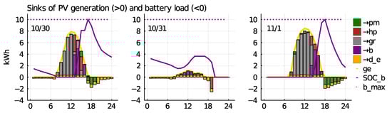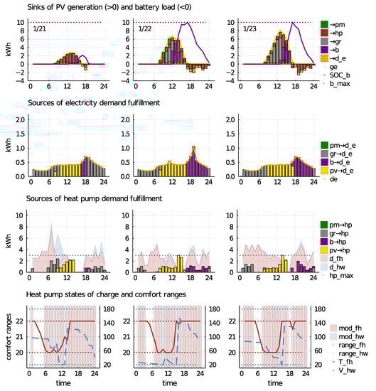 The first row of Figure 3 illustrates PV and BESS operation: positive stacked bars indicate sinks of PV generation, negative bars indicate sinks for BESS discharging. Overall PV generation is shown by the yellow line, the purple line indicates the battery SoC. BESS capacity (b_max) is illustrated by the dotted purple line. The second row illustrates demand fulfillment, electricity demand is shown by the orange line, the stacked bars illustrate the sources used for demand fulfillment. In the third row thermal demand (area plot), as well as energy sources for the HP operation (stacked bars) are presented. Floor heating demand is shown by the red, hot water demand by the blue areas, respectively. The dotted line indicates maximum power of the HP. Finally, the last row illustrates HP operation and thermal SoCs. The bars indicate whether the HP is in floor heating (red), hot water (blue), or off mode (transparent). The red line indicates floor heating SoCs, the red dotted lines, indicated on the left axis, show lower and upper bounds of the floor heating comfort range, 20C and 22C, respectively. The blue dotted lines on the right axis show lower and upper bounds of the comfort range of the hot water SoC (blue line), 20 and 180 L, respectively.