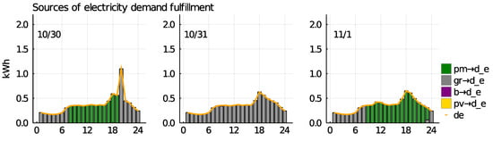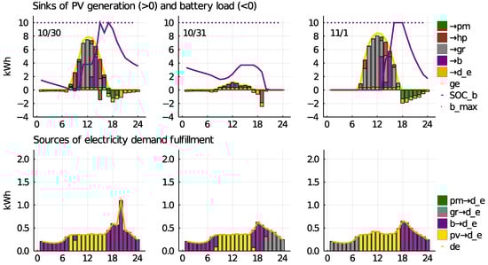 In the following parts of the comprehensive graph in Figure 3 are used to describe the behavior of specific market participants on explanatory days in a year. The color code is standardized throughout the paper: purple represents the battery (b), gray the grid (), green the P2P market (), orange the electricity demand (d_e), yellow the PV generation (g_e), and red the heat pump (). Heat pump operation is further differentiated between floor heating () in red and hot water () in blue.