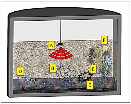 Representation of acoustically influenced processes in anaerobic digester. A. Acoustic streaming; B. Bubble harmonics; C. Vibrational energy imparted to sludge and suspended particles; D. Cavitational inception; E. Bubble drag and lift of solid matter; F. Cavitational collapse.