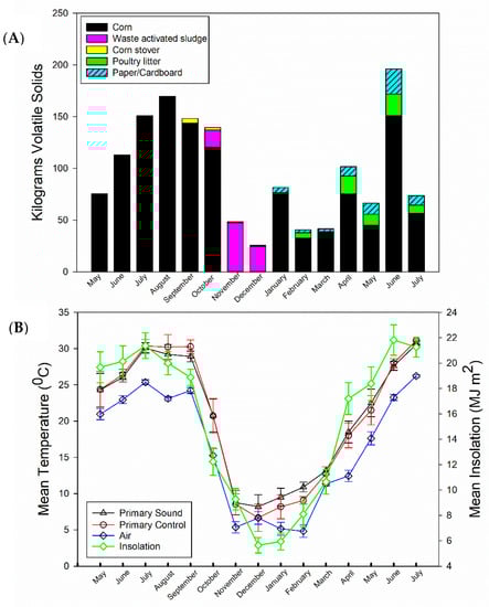(A) Monthly feeding rate and source of volatile solids fed to each anaerobic digester system and (B) environmental conditions during the evaluation period.