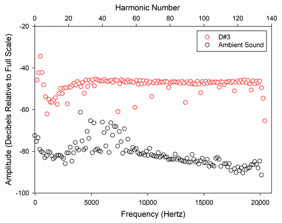 Figure 3 shows the amplitudes of the harmonics detected in the digester from f0 (155.563 Hz) through f137 (21,586 Hz). Higher harmonics could not be detected as this exceeded the recording capabilities of the audio equipment. Likely due to both a vast range of bubble sizes with matching resonant frequencies, as well as multiple harmonics emitted by the resonating bubbles, there was no drop off in the amplitude of these harmonics up to the range of low ultrasonic frequencies. This clearly shows that excitation of the gas saturated digestate with a low-frequency sound can cause ultrasonic emissions due to bubble harmonics at some distance from the sound source. As digesters typically develop distinct sludge and supernatant zones, this indicates that speakers could be placed within the supernatant and used to excite the greatest expanse of sludge while limiting sound attenuation due to suspended particles and bubbles [23]. Given the relatively small volume of the pilot-scale digesters, this was not considered as a problem, but in larger-scale digesters, speaker placement may be more critical.