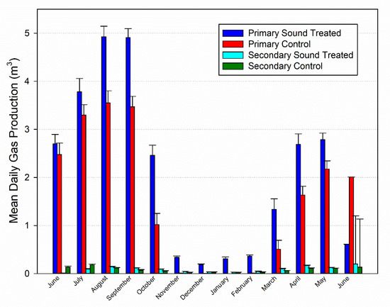 Our results were similar to those of Pham et al. [28], and during the cool period gas production from the primary control was negligible, averaging only 0.1% that of warm weather. On the other hand, while gas production from the sound-treatment was low during the months of November through February, it averaged 74-fold greater that of the control. Table 3 shows the average gas production for the primary and secondary anaerobic digesters for four temperature ranges.