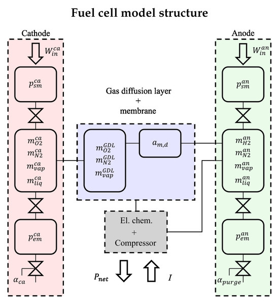 In this section, the FC model used for the control study is presented. The schematics are shown in Figure 1. The focus of the work is not in the model itself, therefore, not all the details will be brought forth, but rather the model structure. For further information on the model equations, the reader is referred to [27].