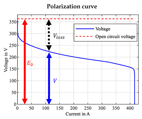 Polarization curve obtained by simulation. The current is ramped up from zero until voltage breakdown. The red dashed line shows the open-circuit voltage, the blue solid line shows the operating voltage. The difference between the two are the losses due to reaction kinetics (activation, ohmic, and concentration) .