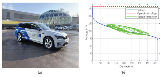 Keytech4EV research vehicle and its measured V-I trajectory superimposed to the simulated polarization curve brought for visualization of the operating range. (a) Vehicle developed by AVL List GmbH from which the data has been acquired for the validation of this study. (b) Measured V-I trajectory of the vehicle.