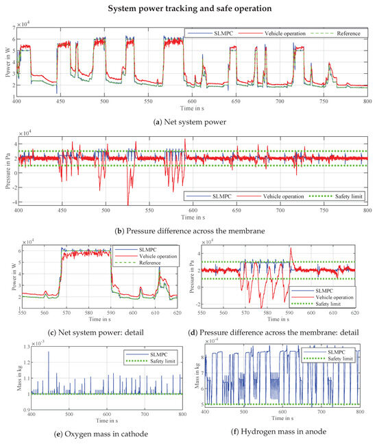The controller shows its capability of ensuring safe operation in various aspects. Firstly, it cankeep the pressure difference across the membrane between its bounds Equation (29) as shown in Figure 4b. Examining the segment of the drive cycle shown in Figure 4d, a few key points should be mentioned. The power demand during the shown segment is the highest (60 kW) so purging events happen more often than at other instances. The SLMPC can react and keep the pressure difference within the safety limits due to the knowledge of the upcoming purging event and thus proving to be a promising concept for fuel cell dynamic control. The conventional control procedure in the vehicle was not able to maintain the pressure difference value within the safety range. Secondly, the controller can keep the system from operating in starvation conditions by always having a reserve of reactant mass as shown in Figure 4e,f. It is worth noting that the oxygen and hydrogen masses shown in Figure 4e,f are not measured, but are the internal states of the fuel cell given by the model. In future work, if the model is validated and proven to represent reality accurately, the knowledge of internal states can be of great importance, as shown in this work.